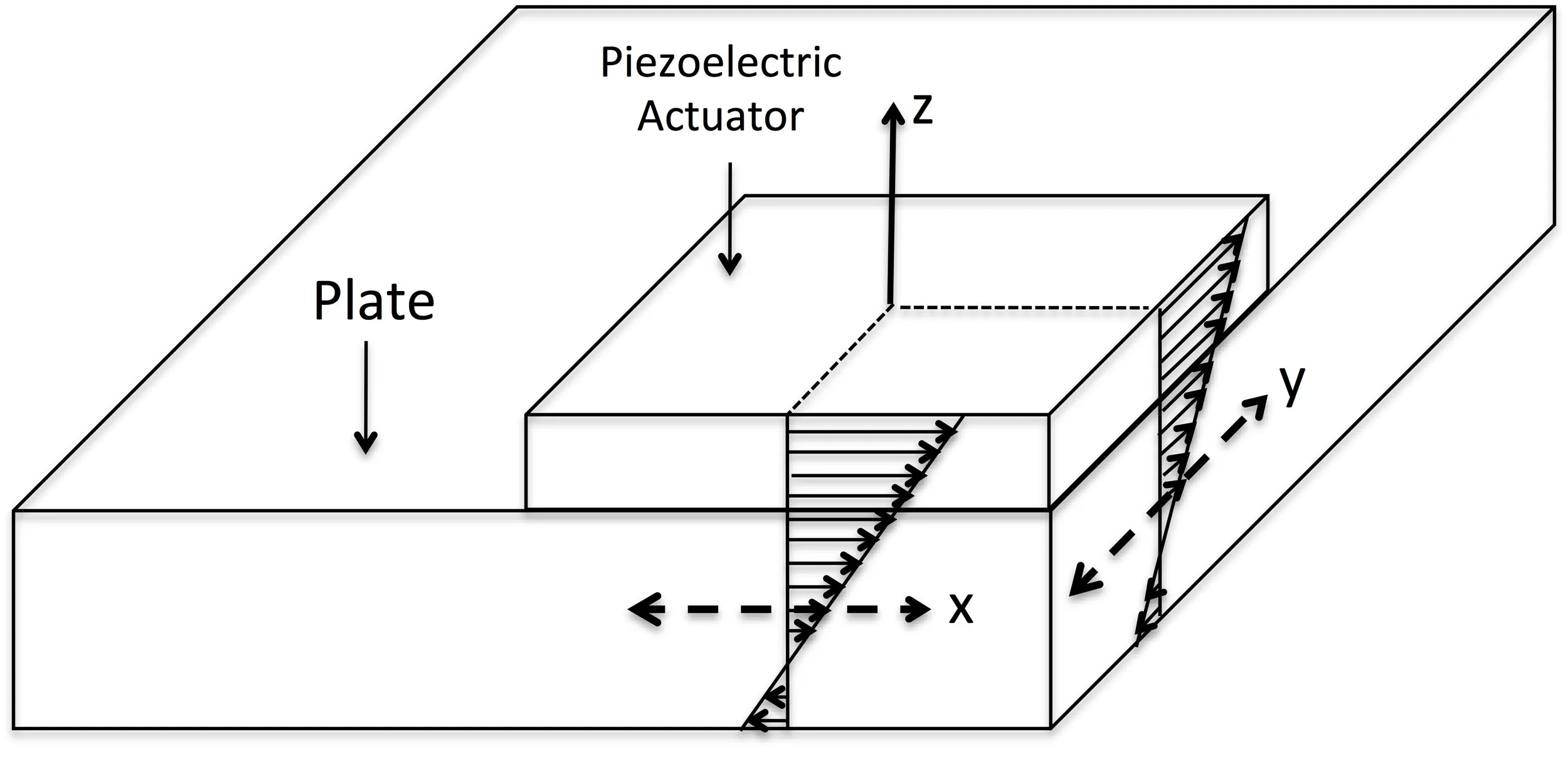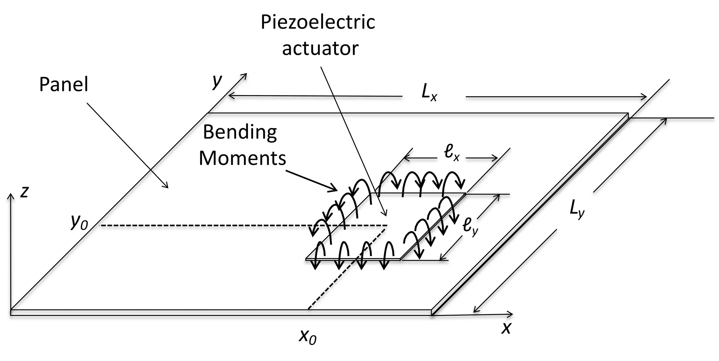 The above loudspeakers were designed using inertial force exciters, which can take up a considerable amount of space behind the panel. In devices such as smartphones and tablets, where space inside the device is limited, an alternative form of excitation may be needed to meet the required form-factor. Piezoelectric actuators are very thin compared to commercially available inertial exciters, and may be bonded directly to the rear of a panel. Piezoelectric actuators induce strain in the panel when a voltage is applied across the polarization axis as shown below. This strain distribution can be modeled as bending moments at the actuator edges. This analysis follows some great work by a number of researchers, and specific models developed by Dimitriadis et al. and Gibbs and Fuller.