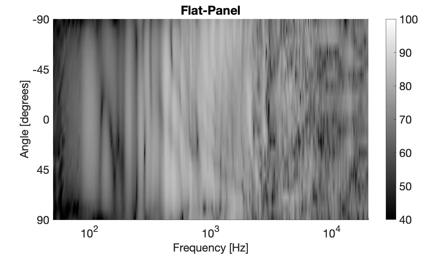 The resonant modes also affect the frequency response and directivity reproduced signal. Measurements of the SPL polar patter vs. frequency are shown below. Notice the many fluctuations with both frequency and angle for the panel compared to a conventional speaker.