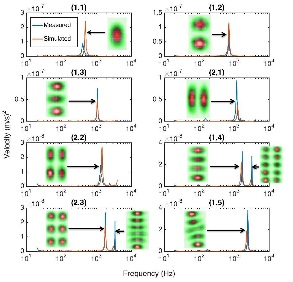 To eliminate resonant effects at low-frequencies, a driver array may be employed to cancel or selectively drive mode(s) with desirable radiation properties (such as the (1,1) mode of a simply supported panel), and cancel the responses of a select number of other modes. An array of N drivers can selectively cancel/excite N modes independently. At high frequencies, the array will start to alias and excite a number of uncontrolled modes. An example of how a driver array can be configured to selectively excite different modes of a panel is shown below. The spatial aliasing described above can be seen in the scans of the (1,4) and (2,3) modes, where the (2,5) and (1,6) modes, respectively are simultaneously excited.