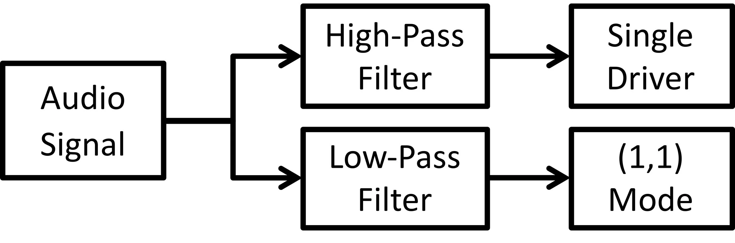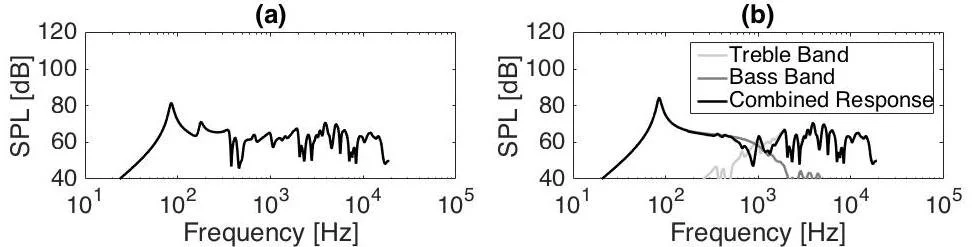 A modal crossover network is a system that uses filters to reproduce audio signals through the vibration modes (or sets of modes) that have desirable sound radiation properties (and more importantly, avoid playing audio through modes with undesirable radiation patterns). An example of one possible configuration for this is demonstrated below. Here a two-band crossover network is used, where the low-frequency band is reproduced through the fundamental mode of a simply-supported rectangular panel via and actuator array, and the high-frequency band is reproduced through a single driver on the panel. The two bands can be equalized to produce a much smoother acoustic frequency response (b) than that produced when playing the full audio band through a single driver (a).
