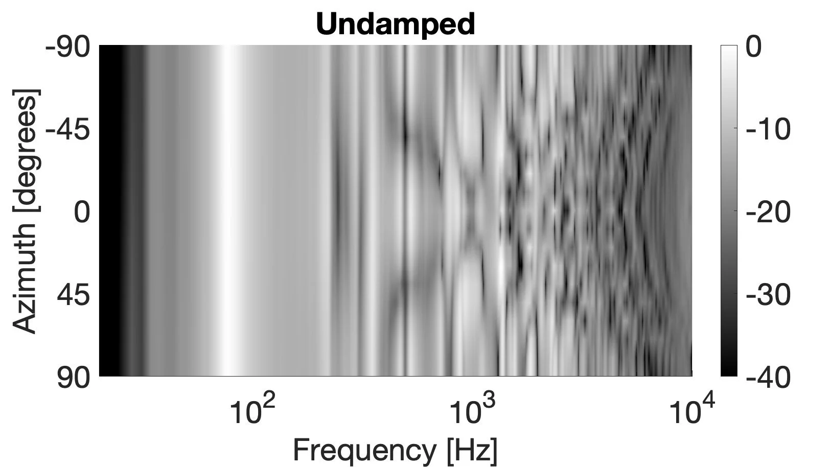 Building the panel out of a material with high damping (or introducing additional damping into the system) can help to smooth out the response of the panel. Damping is most effective at high-frequencies, where the panel has a naturally higher velocity. It is not as effective at reducing the effects of isolated low-frequency bending modes. Note that the SPL in this plots was computed from the measured acceleration of the panel via the Rayleigh Integral, and is normalized relative to the maximum sound pressure level (SPL).