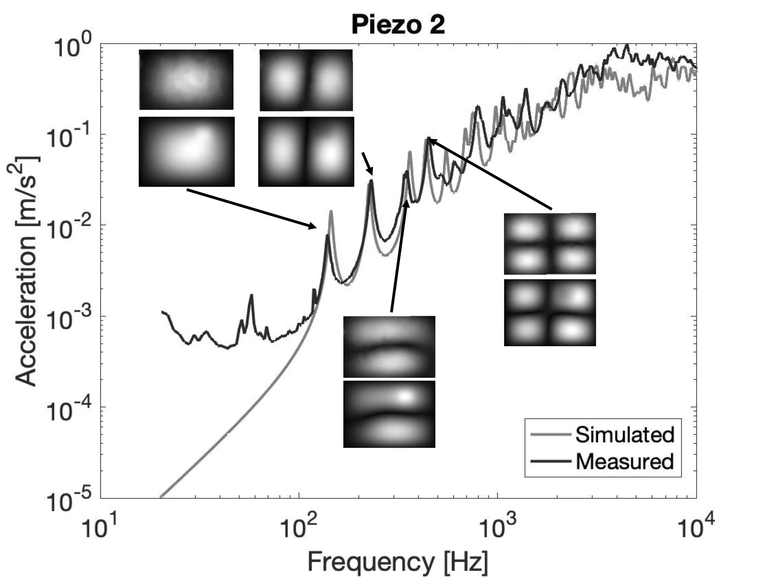 Panel loudspeakers excited by piezoelectric actuators typically have a weaker bass response due to the relatively weak coupling between the dimensions of the actuator and the half-wavelength of the fundamental bending mode of the panel. This is shown by the increasing panel acceleration with increasing frequency in the measurements below for two different piezo locations. However, in small devices such as smartphones, this fundamental half-wavelength could be much shorter and allow for stronger actuator/panel coupling without incurring additional costs associated with manufacturing large piezoelectric actuators. Since piezoelectric actuators have very strong coupling to high-frequency modes, they may be best used as tweeters in a two-way modal crossover flat-panel speaker, where the low frequencies are reproduced through an array of inertial actuators, and the high-frequencies are reproduced through a single piezoelectric actuator.