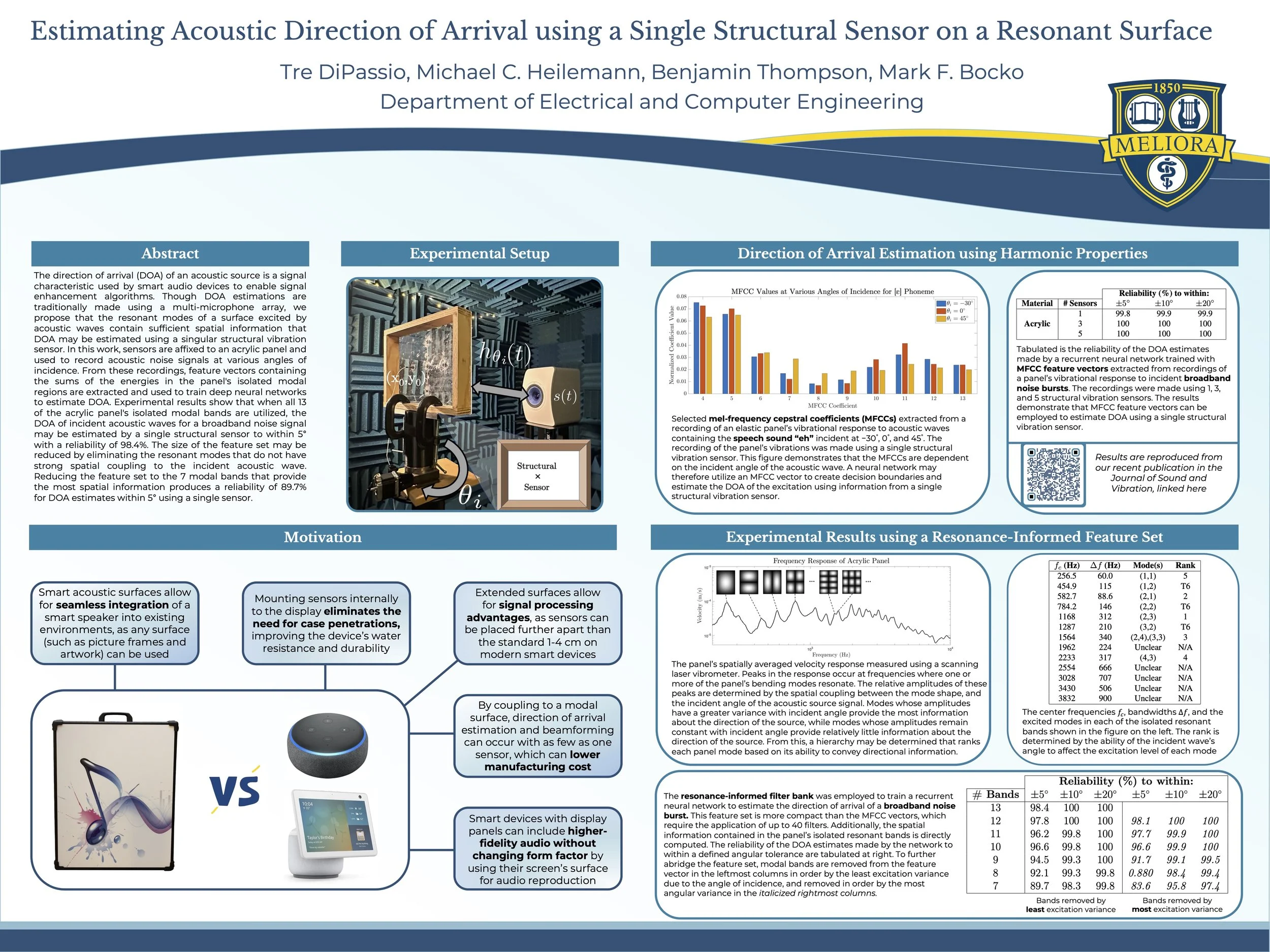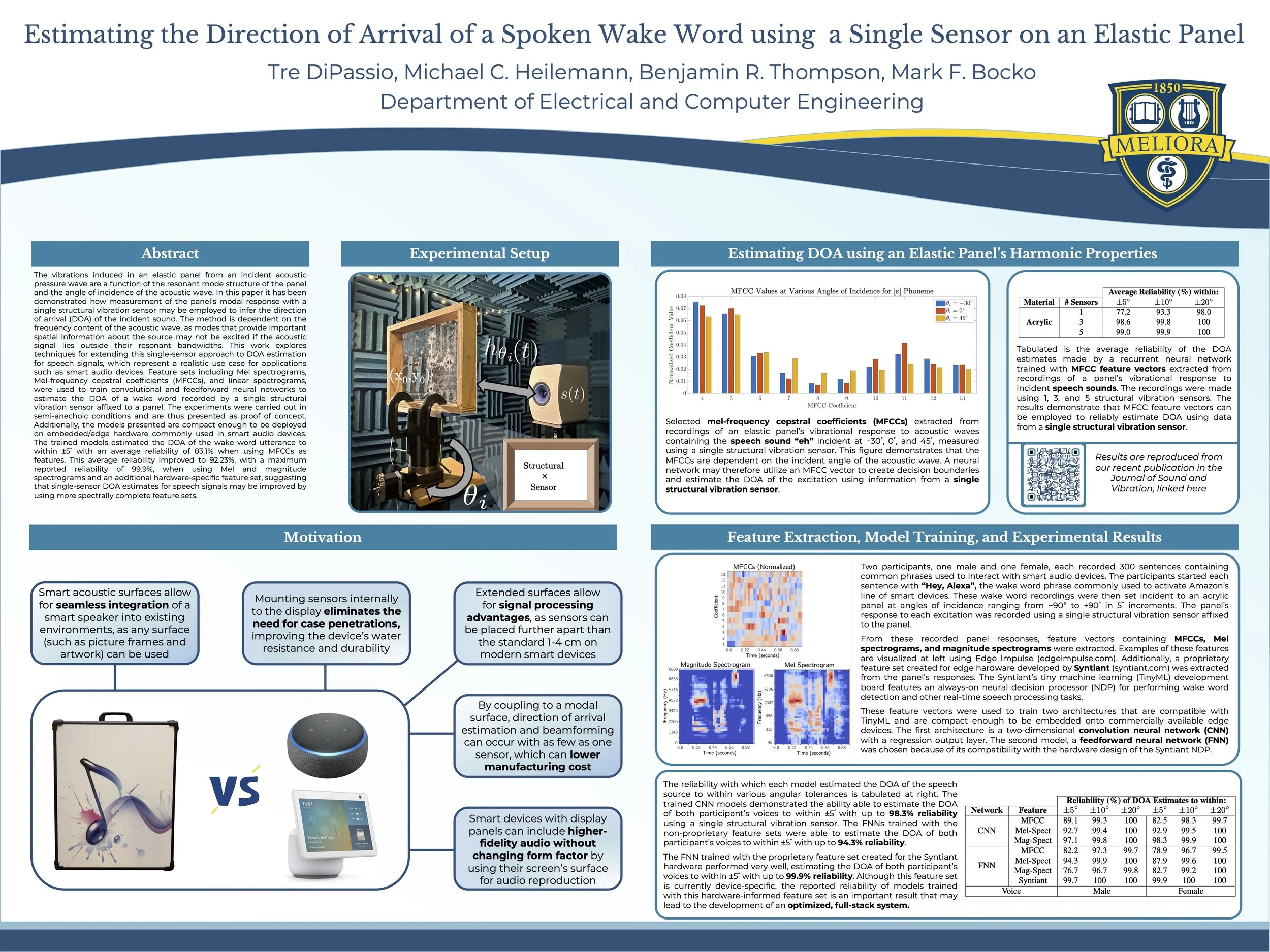 [J9] J. Rutowski, T. DiPassio, B. R. Thompson, M. F. Bocko, and M. C. Heilemann “Estimating Direction of Arrival in Reverberant Environments for Wake-Word Detection Using a Single Structural Vibration Sensor,” J. Acoust. Soc. Am., vol. 156, No. 4, pp. 2619–2629, Oct 2024. https://doi.org/10.1121/10.0032367