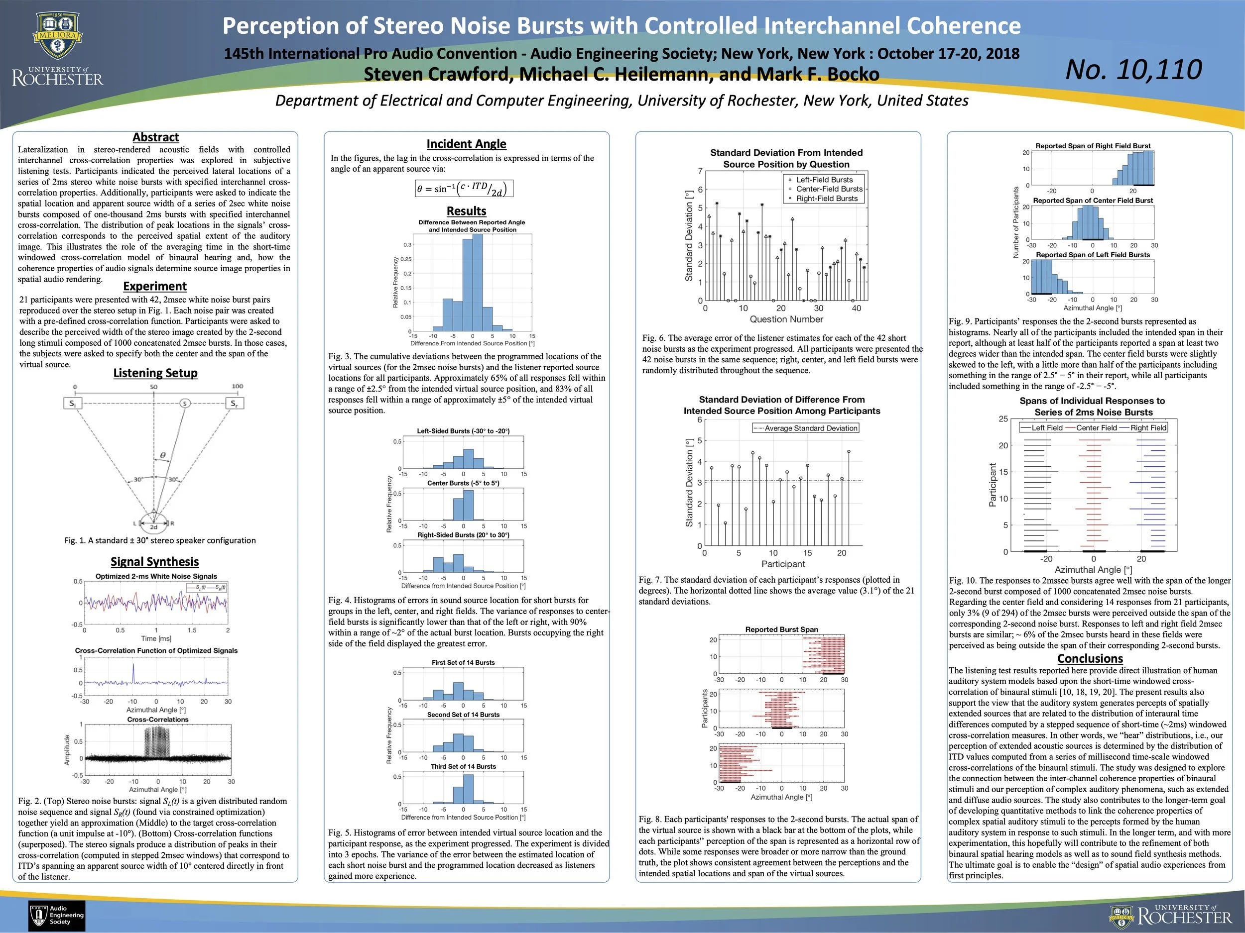 [C5] S. Crawford, M. C. Heilemann, and M. F. Bocko, “Perception of stereo noise bursts with controlled interchannel coherence,” 145th Convention of the Audio Engineering Society, New York, New York, Oct 2018. https://www.aes.org/e-lib/browse.cfm?elib=19836
