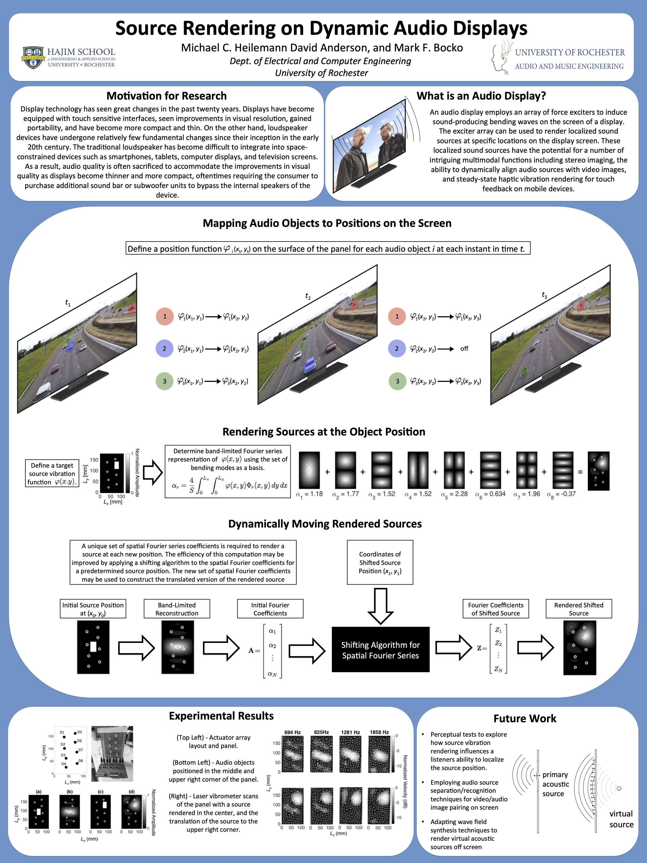[C2] M. C. Heilemann, D. A. Anderson, and M. F. Bocko, “Source rendering on dynamic audio displays,” 2017 IEEE Workshop on Application of Signal Processing to Audio and Acoustics (WASPAA), New Paltz, New York, Oct 2017. https://doi.org/10.1109/WASPAA.2017.8170050
